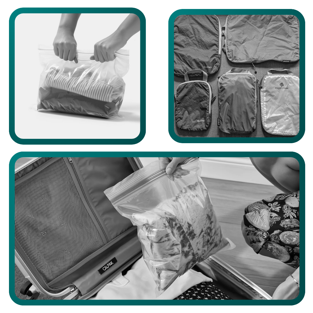 VacPaq bags (26cm × 41cm × 14cm) fit easily in any standard carry-on (22" × 14" × 9"). Most travelers fit 2-3 compressed bags plus shoes, toiletries, and electronics in one carry-on suitcase. If you're using a smaller personal item or backpack, we recommend starting with 1-2 bags.