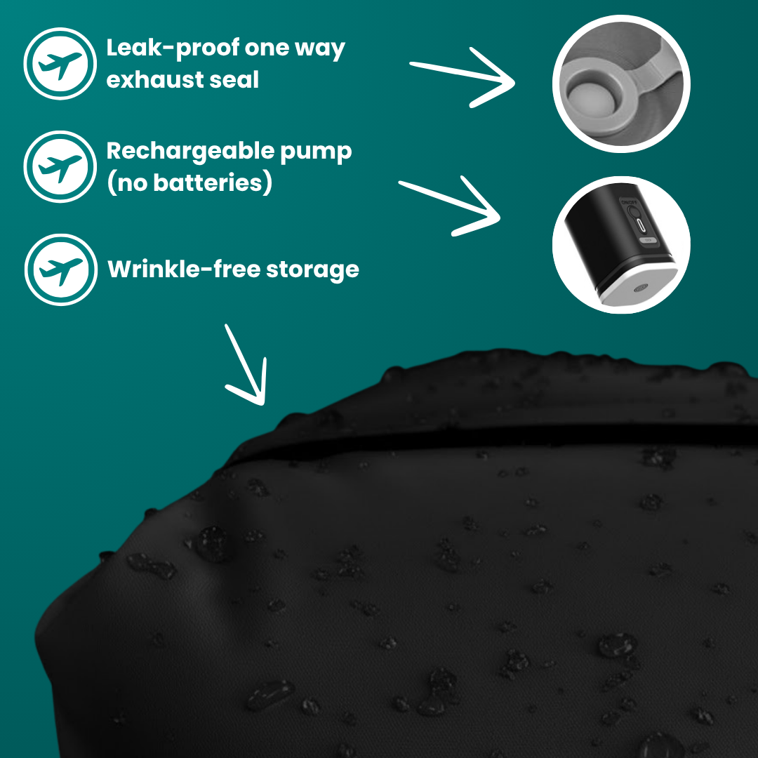 A one-way valve that locks air out and keeps clothes flat until you unpack.
